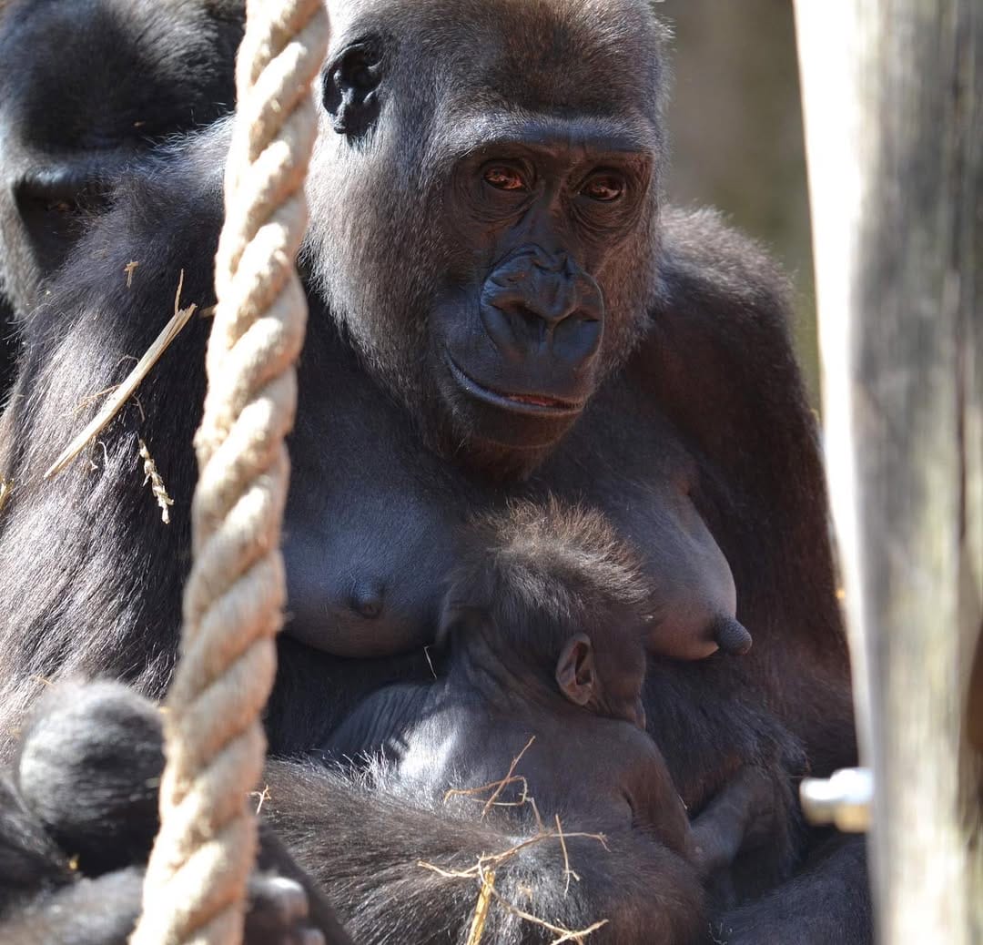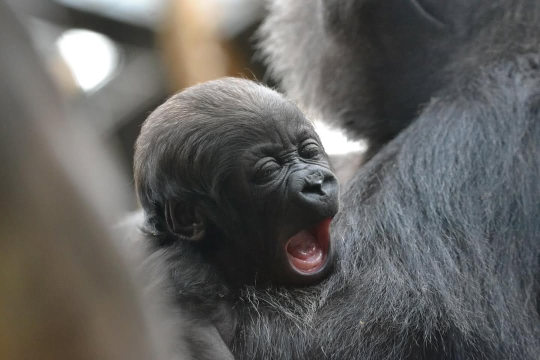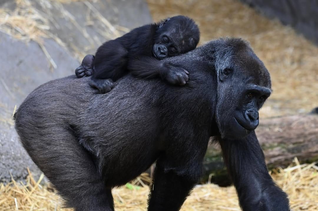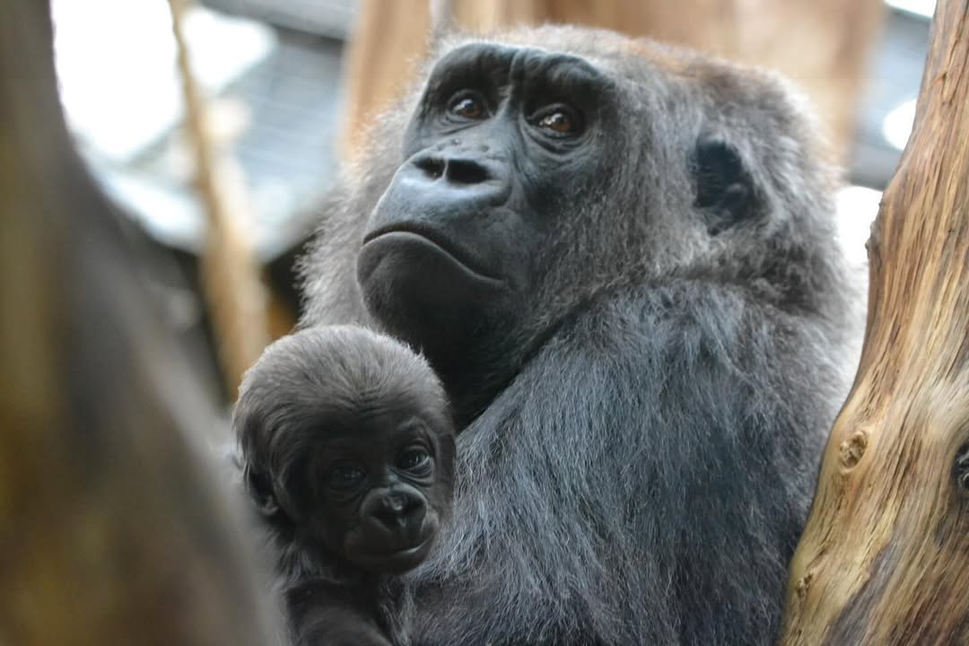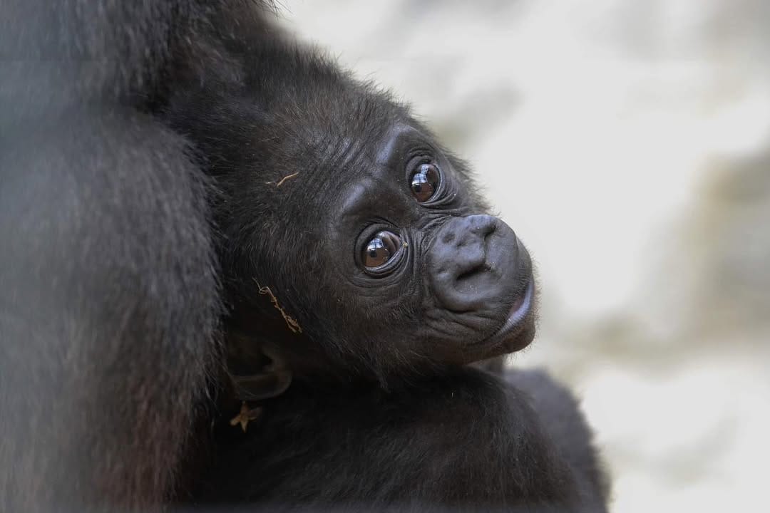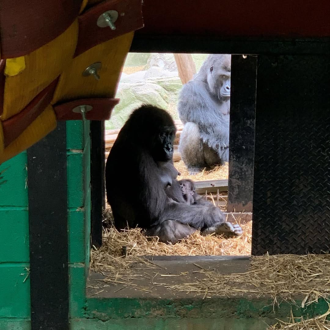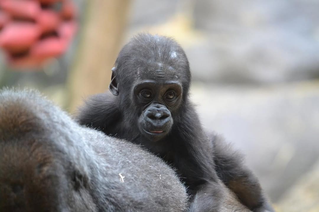 Aarde is a baby Western Lowland gorilla at Chessington World of Adventures & Zoo. He was born on April 24, 2022, to mother Shanga and father Damisi, both part of the Chessington gorilla troop. Aarde is one of nine gorillas in the troop, which includes adults, teenagers, and other babies. Western Lowland gorillas are the smallest and most widespread subspecies of gorilla, native to Central and Western Africa, and are critically endangered. Aarde has been featured as an adorable baby gorilla, often seen playing and exploring his surroundings at the zoo. The troop is led by the silverback Damisi, and includes breeding females and younger gorillas in various life stages.