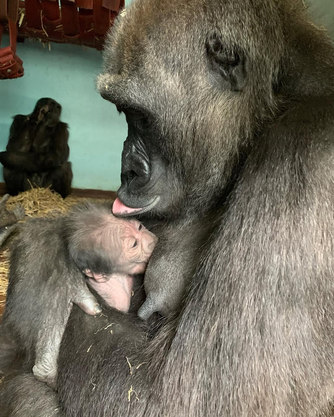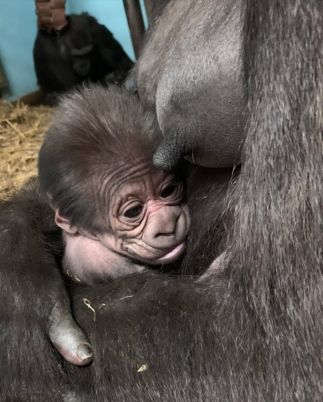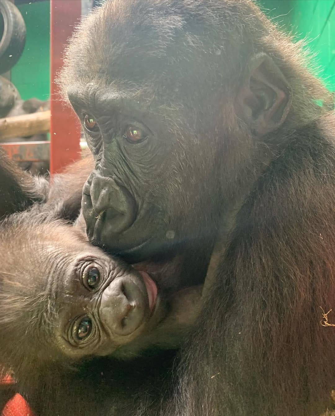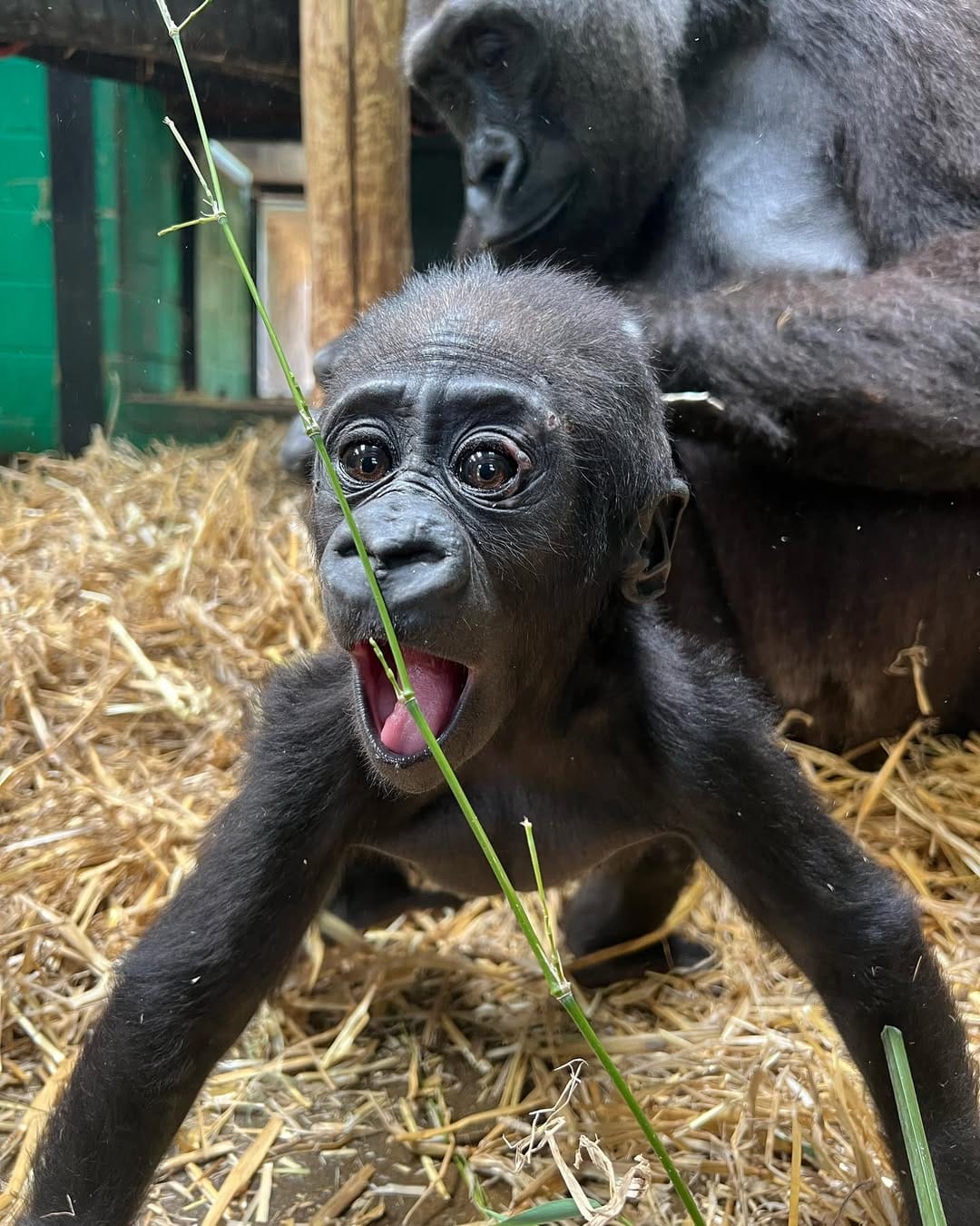 Aarde is a baby Western Lowland gorilla at Chessington World of Adventures & Zoo. He was born on April 24, 2022, to mother Shanga and father Damisi, both part of the Chessington gorilla troop. Aarde is one of nine gorillas in the troop, which includes adults, teenagers, and other babies. Western Lowland gorillas are the smallest and most widespread subspecies of gorilla, native to Central and Western Africa, and are critically endangered. Aarde has been featured as an adorable baby gorilla, often seen playing and exploring his surroundings at the zoo. The troop is led by the silverback Damisi, and includes breeding females and younger gorillas in various life stages.