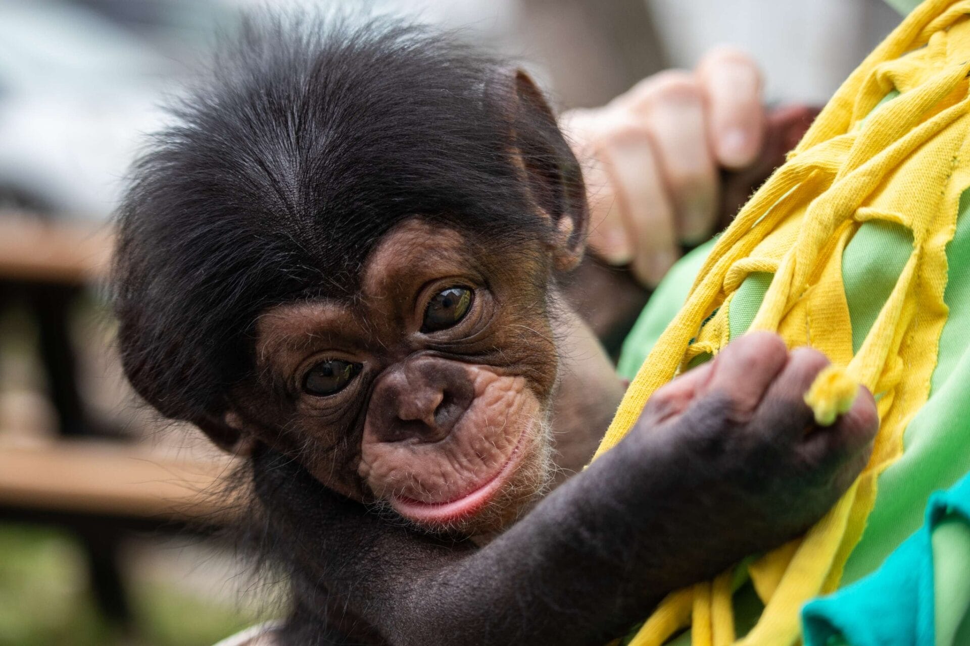 Chimpanzees are highly social animals, learning essential behaviors — communication, hierarchy, and play — from their troop. These are lessons no human caregiver can fully replace.