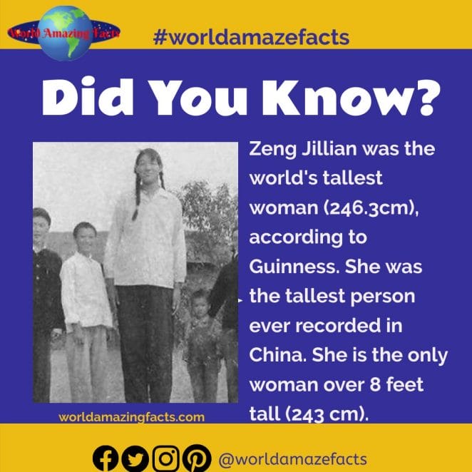 11: Zeng Jillian was the world’s tallest woman (246.3cm), according to Guinness. She was the tallest person ever recorded in China. She is the only woman over 8 feet tall (243cm).