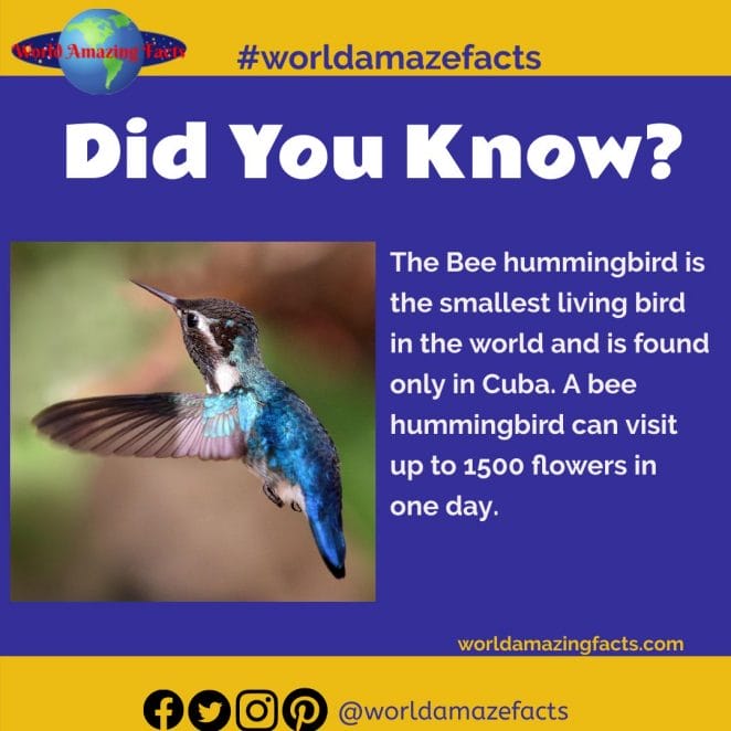 12: The Bee hummingbird is the smallest living bird in the world and is found only in Cuba. A bee hummingbird can visit up to 1500 flowers in one day.