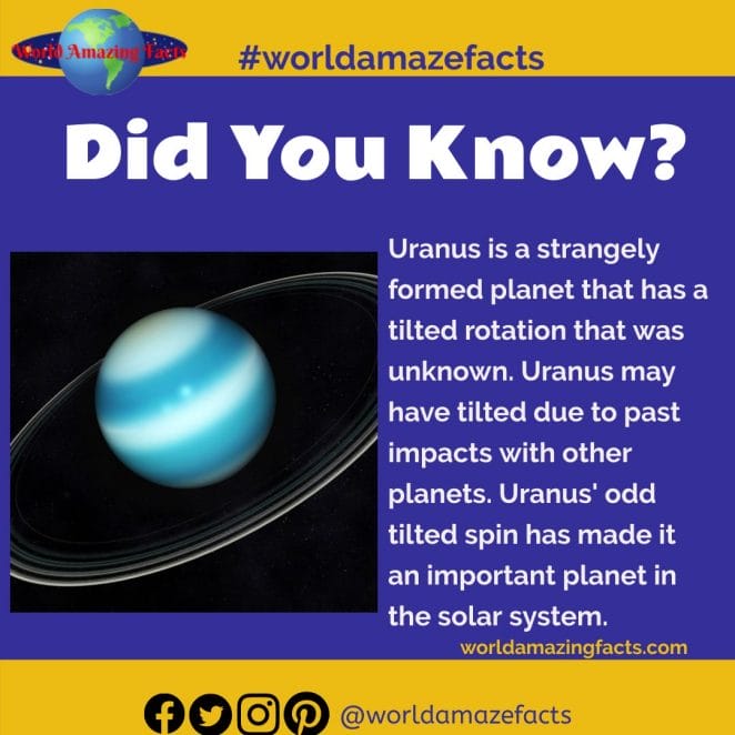 13: Uranus is a strangely formed planet that has a tilted rotation that was unknown. Uranus may have tilted due to past impacts with other planets. Uranus’ odd tilted spin has made it an important planet in the solar system.