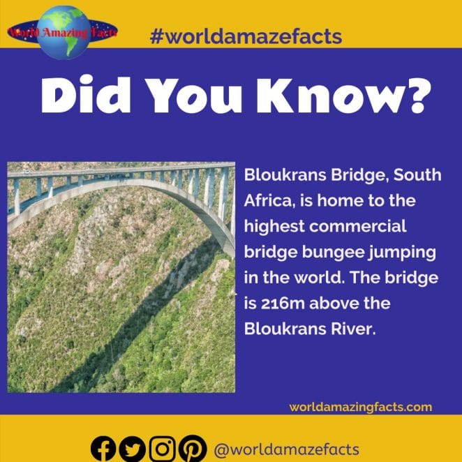 14: Bloukrans Bridge, South Africa, is home to the highest commercial bridge bungee jumping in the world. The bridge is 216m above the Bloukrans River.