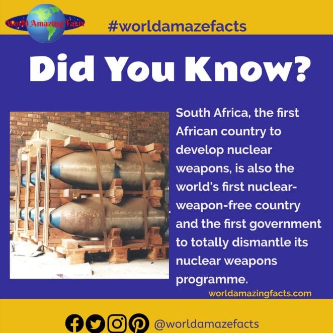 15: South Africa, the first African country to develop nuclear weapons, is also the world’s first nuclear-weapon-free country and the first government to totally dismantle its nuclear weapons programme.