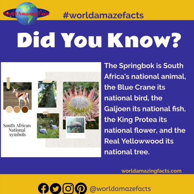 16: The Springbok is South Africa’s national animal, the Blue Crane its national bird, the Galjoen its national fish, the King Protea its national flower, and the Real Yellowwood its national tree.