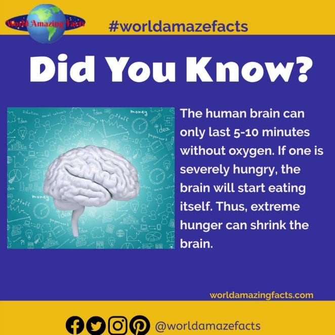 18: The human brain can only last 5-10 minutes without oxygen. If one is severely hungry, the brain will start eating itself. Thus, extreme hunger can shrink the brain.