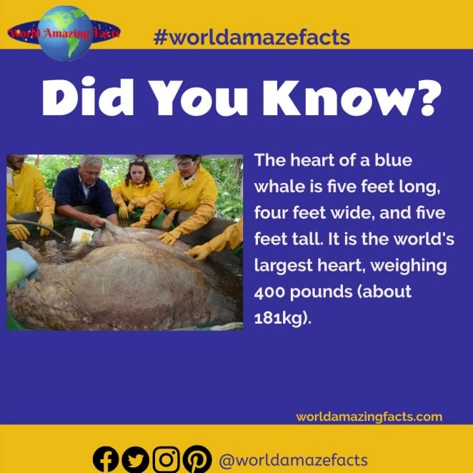 21: The heart fo a blue whale is five feet long, four feet wide, and five feet tall. It is the world’s largest heart, weighing 400 pounds (about 181kg)
