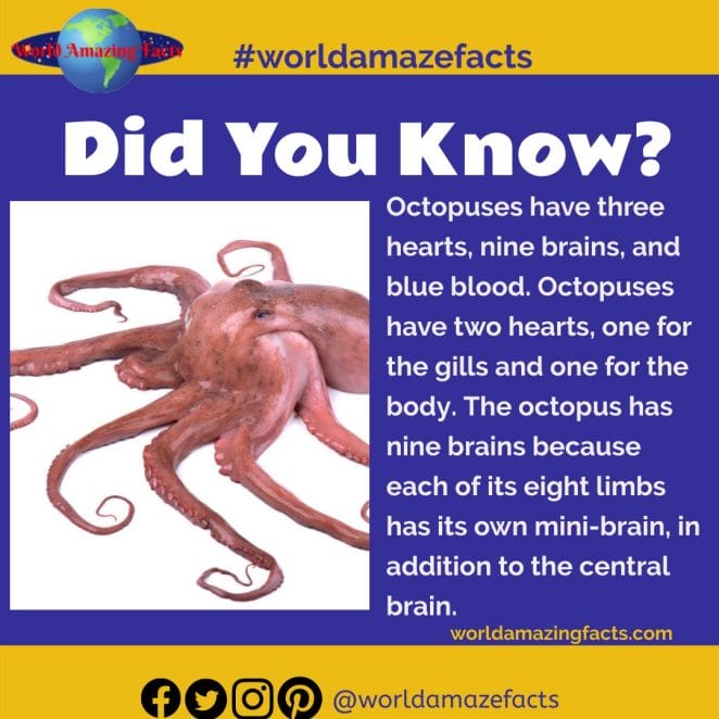 23: Octopuses have three hearts, nine brains, and blue blood. Octopuses have two hearts, one for the gills and one for the body. The octopus has nice brains because each of its eight limbs has its own mini-brain, in addition to the central brain.