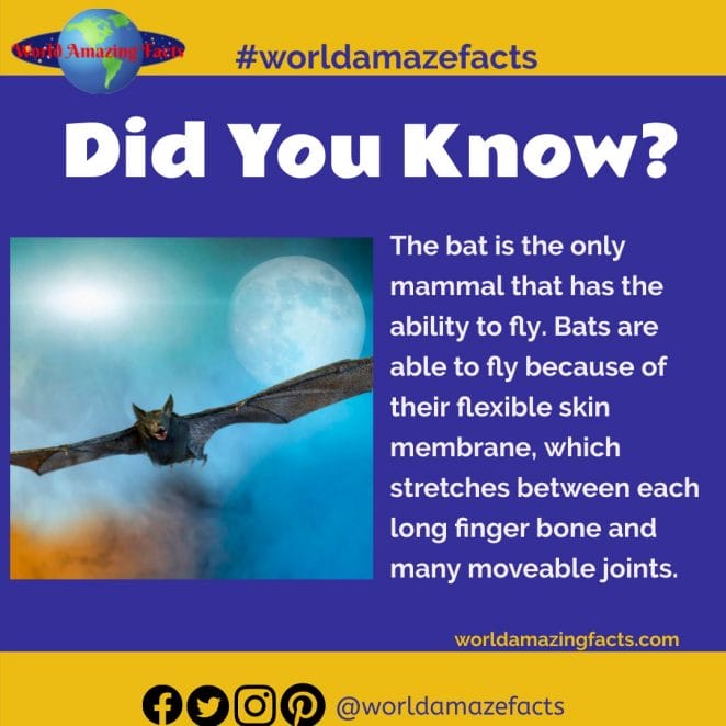 24: The bat is the only mammal that has the ability to fly. Bats are able to fly because of their flexible skin membrane, which stretches between each long finger bone and many moveable joints.