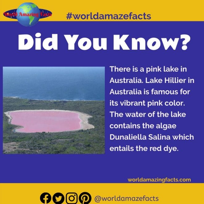 25: There is a pink lake in Australia. Lake Hillier in Australia is famous for its vibrant pink color. The water of the lake contains the algae Dunaliella Salina which entails the red dye.