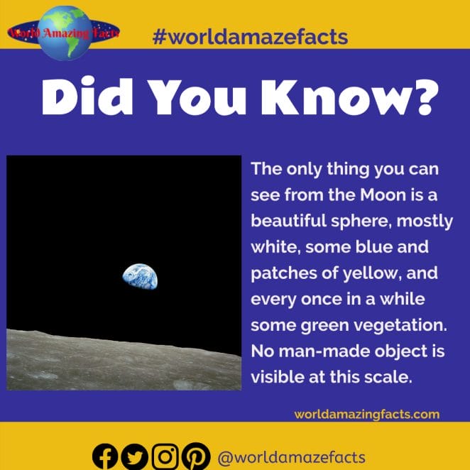 5: The only thing you can see from the Moon is a beautiful sphere, mostly white, some blue and patches of yellow, and every once in a while some green vegetation. No man-made object is visible at this scale.