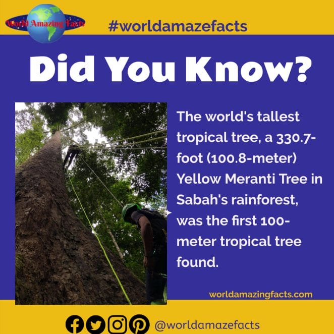 6: The world’s tallest tropical tree, a 330.7 foot (100.8 meter) Yellow Meranti Tree in Sabah’s rainforest, was the first 100 meter tropical tree found.