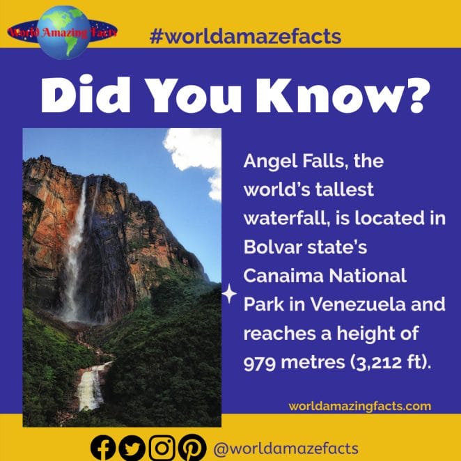 8: Angel Falls, the world’s tallest waterfall, is located in Bolvar state’s Canaima National Park in Venezuela and reaches a height of 979 metres (3,212 ft).