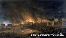 The Great Fire of London began inadvertently on this day in 1666 at the house of the king's baker; it raged for four days and destroyed a huge portion of the city, including Old St. Paul's Cathedral and over 13,000 houses.