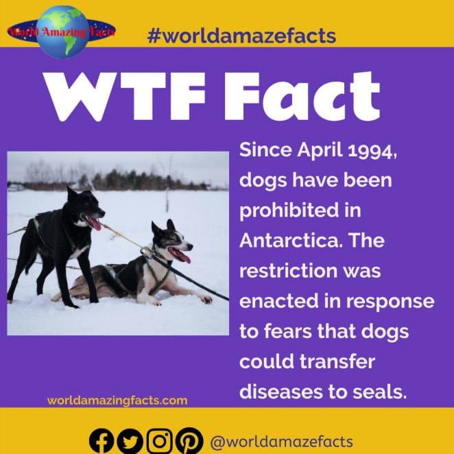 27. Since April 1994, dogs have been prohibited in Antarctica. The restriction was enacted in response to fears that dogs could transfer diseases to seals.